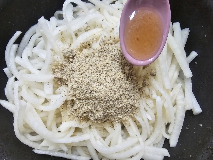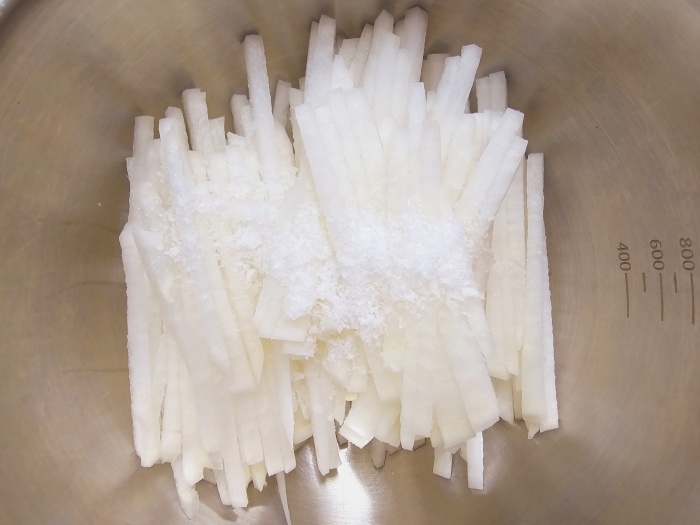 채 썬 무는 꽃소금 1큰술 넣고 절여요.