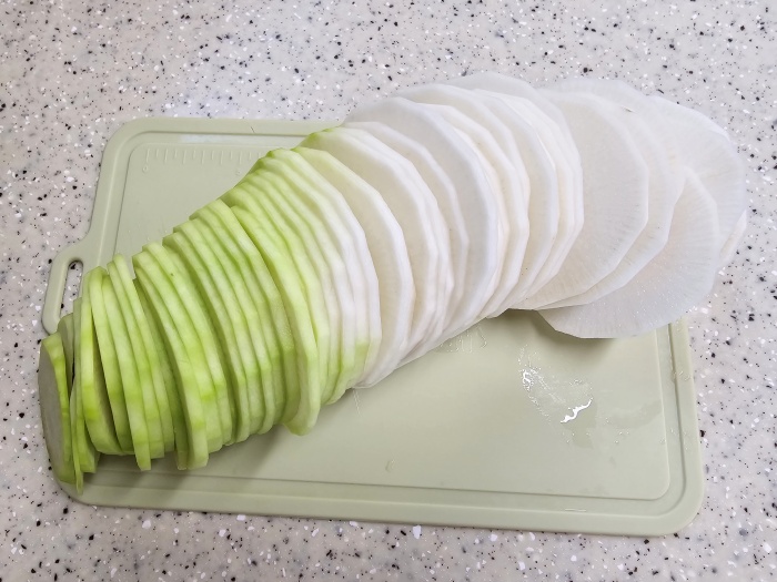 무 한 개로 요리하면 두 가지의 반찬을 만들 수 있어요.