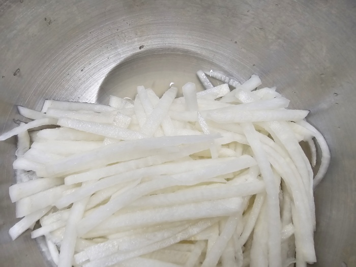 무의 2/3개를 굵지 않게 채 썰어줬어요.